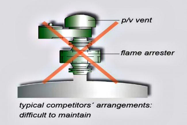 การติดตั้ง Breather valve และ Flame arrester ที่ไม่เหมาะสมคือ อ้างอิงตาม ISO 16852 chapter 7.3.1: Flame arresters directly combined with separate P/V-valves used as end-of-line venting system shall be tested in the same way as end-of-line flame arresters with integrated P/V-vales. จากรูปคือการติดตั้งที่ผิดวิธีเนื่องจากเหตุผลดังต่อไปนี้ 1.การออกแบบไม่คำนึงถึงความปลอดภัย โดยการนำ Flame arrester แบบ inline type มาติดตั้งต่อกับ Breather valve หรือ Pressure and vacuum relief valve…